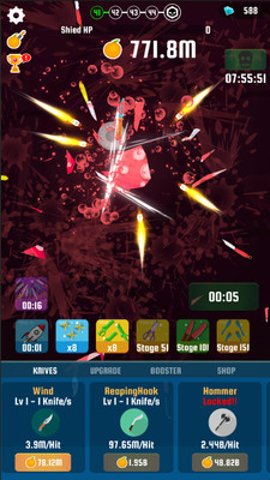 2、飞刀的升级系统使得玩家能够不断提升自己的战斗力,解锁更强大的飞刀,享受更高的切割效率。