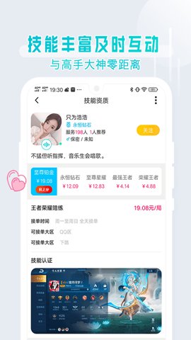 3、拥有丰富的陪玩档案展示,查看陪玩者的游戏记录、技能水平以及玩家评价,帮助自己做出更好的选择。