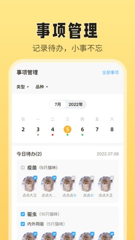 2、事项管理模块支持用户制定详细的日程安排,包括疫苗接种、驱虫等重要事项,确保猫咪健康。