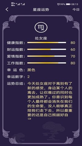 在主界面选择“星座运势”选项,系统会自动显示你所选择星座的每日运势,方便用户快速获取信息。