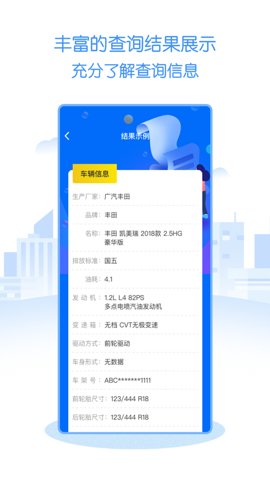1、车辆信息查询功能,一键查询车辆的出厂名称、品牌、车型等信息,帮助用户快速了解车辆的基本情况。