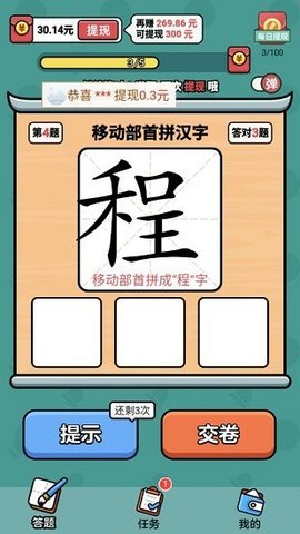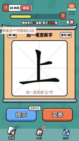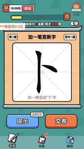 汉字的字是一款充满趣味的游戏,旨在通过有趣的玩法帮助玩家了解汉字的文化与构造。在这个游戏中,玩家的主要目标是通过改变汉字的笔画来完成各个关卡。每一关的汉字设计独特,随着游戏的进行,难度也逐渐提升。成功通关后,玩家不仅能获得丰厚的红包奖励,还能在挑战中不断提升自己的汉字水平,体验到学习与游戏结合的乐趣。