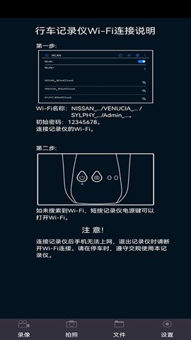 请在手机的Wi-Fi设置中找到记录仪的Wi-Fi名称,如NISSAN、VENUCIA等,输入初始密码12345678进行连接。如果未能搜索到Wi-Fi,请短按记录仪电源键以打开Wi-Fi。