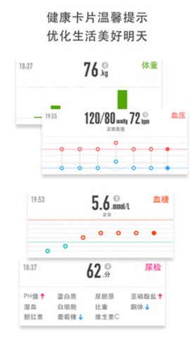 1、支持多项健康数据记录,包括血糖、血压、体重、体脂等,一站式管理自己的健康信息。