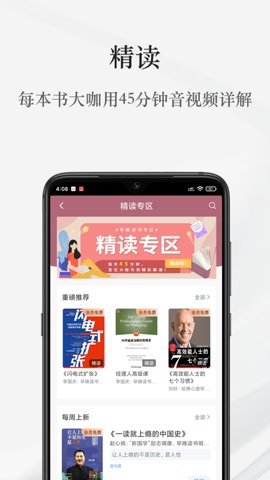 2、每年提供100本精读书籍,配合45分钟的音视频详解,帮助用户深入理解书籍的核心思想。