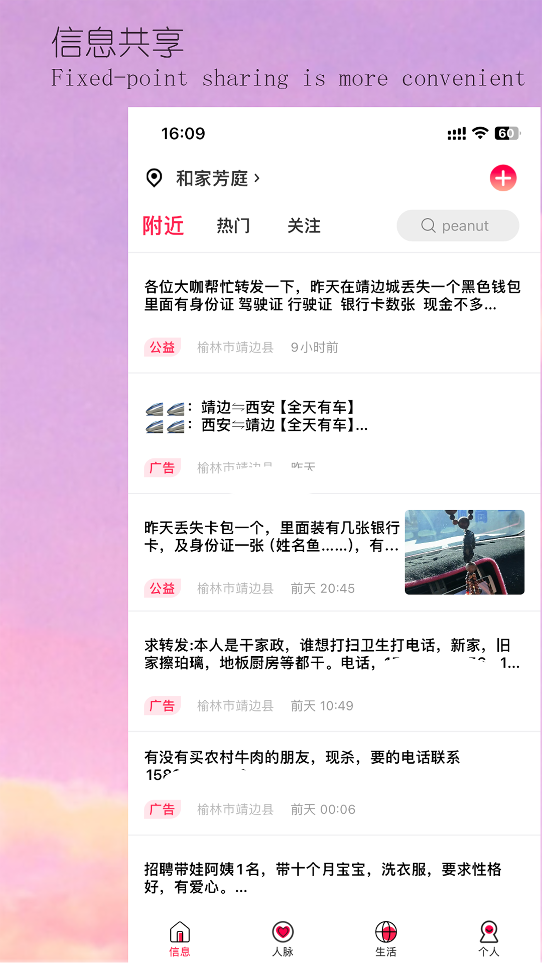 3、在主界面上,你会看到不同的分类选项,生活信息、服务人脉、美好分享等,点击你感兴趣的分类即可浏览相关内容。
