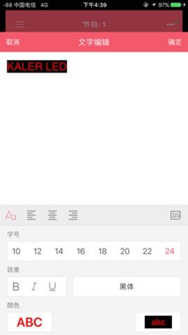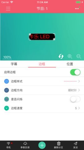2、卡乐光电还支持在手机上控制LED显示屏,使用卡乐光电这款app在手机上配置字幕、边框以及位置的详细信息,支持上屏方式、停留、速度、纵向偏移、文字选择等功能的设定,还可以设置文字边框是否闪烁,功能优化的十分细致。