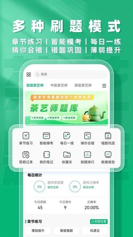 茶艺师题库帮是一款针对茶艺师资格认证考试设计的移动学习应用,拥有与官方考纲同步的练习资源。从茶叶分类到冲泡流程,从茶文化历史到服务礼仪,各类考点都能在应用中找到对应题目。