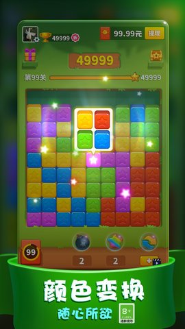 1、玩家只需点击两个或以上相同颜色的方块,即可将其消除,得分与消除方块的数量成正比,越多得分越高。