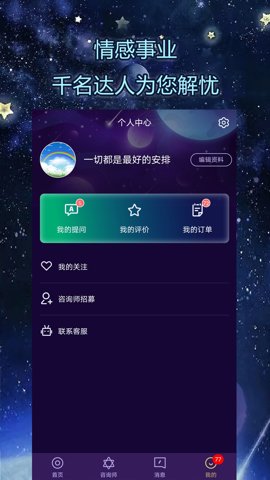 问星app是一款全新的星座塔罗在线占卜咨询社区,致力于为用户提供优质的占星和塔罗服务。无论你对星座知识感兴趣,还是想要进行占星测星盘,问星都能满足你的需求。通过这款应用,随时随地获取专业的解读与分析,还能享受到更多丰富的功能。问星汇聚了众多优秀的咨询师,全天候为你提供一对一的问答服务,帮助你在生活的各个方面找到幸福的指引。无论是爱情、事业还是个人成长,问星都能为你提供支持与帮助。