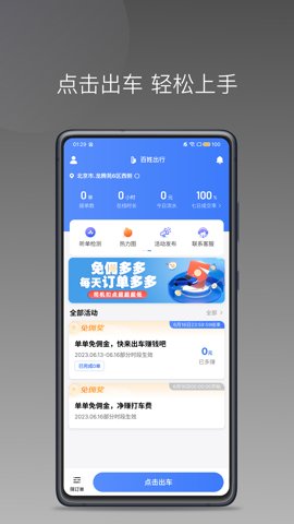 1、一键出车:司机只需简单点击,即可快速出车,节省时间,提升接单效率。
