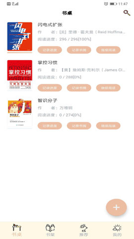 1、打开应用后,用户将直接进入书桌页面,在这里可以看到自己当前的阅读列表,随时添加新的读书笔记。
