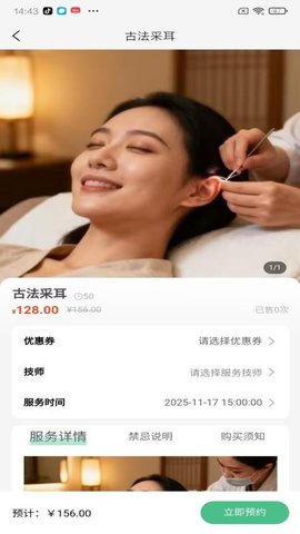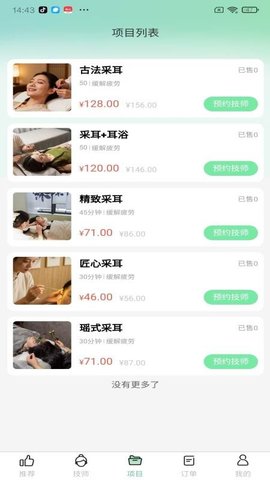 2、在项目分类页面,可以按照不同的服务类型或价格区间,筛选并查看所有可预约的采耳服务。