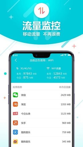 3、流量监控功能,实时显示各个应用的流量消耗情况,便于用户进行合理的流量管理。