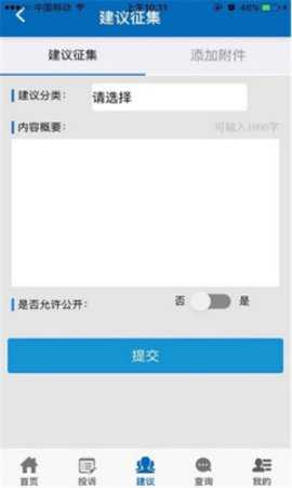 3、填写信访事项:在首页点击“投诉请求”或“建议征集”,根据提示选择问题分类,详细填写诉求内容后提交。