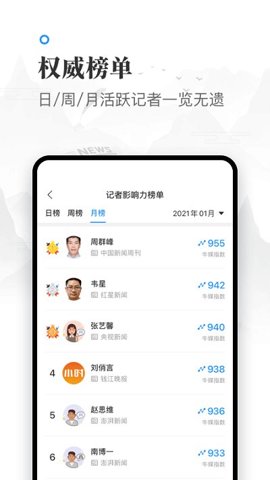 2、影响力榜单显示,选择日榜、周榜或月榜,查看记者的影响力排名,帮助决策。