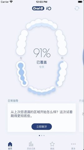 3、刷牙挑战,参加刷牙挑战,了解自己在均匀清洁口腔后的效果,并提交分数以完善刷牙程序。