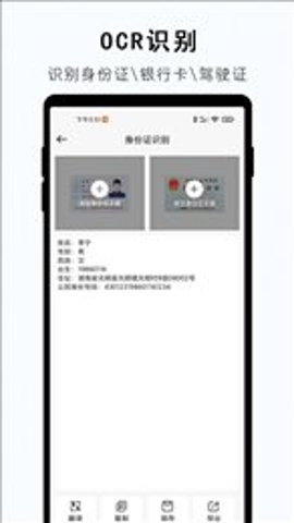 3、OCR识别功能:支持身份证、银行卡、驾驶证等证件的快速识别,用户只需拍照或导入文件即可。