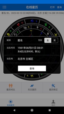 1、在线星盘查询功能,用户可输入出生信息,获取详细的星盘图和解析。