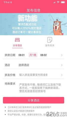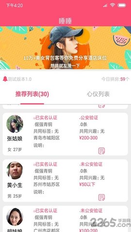 睡睡同住app是一款独特的酒店同住社交平台,旨在为需要住宿的用户提供便捷的拼房服务。对于经常出差的朋友来说,面对公司报销的限制,选择一间舒适的酒店有时会显得格外困难。而睡睡同住正是为此而生,让你在出行时不仅能找到合适的住宿,也能结识志同道合的朋友。无论是出差还是旅行,睡睡同住都能让你的旅途不再孤单,快来2265安卓网体验这款新颖的应用吧!