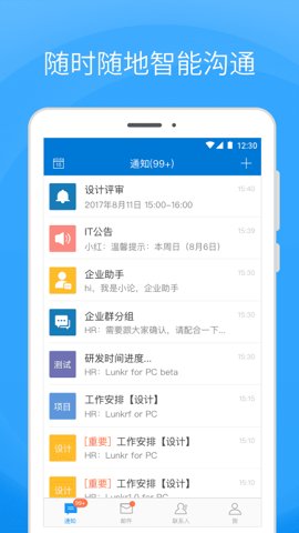 企业通讯录功能提供树状架构显示,快速找到相关同事,提升沟通效率,便于资源整合。