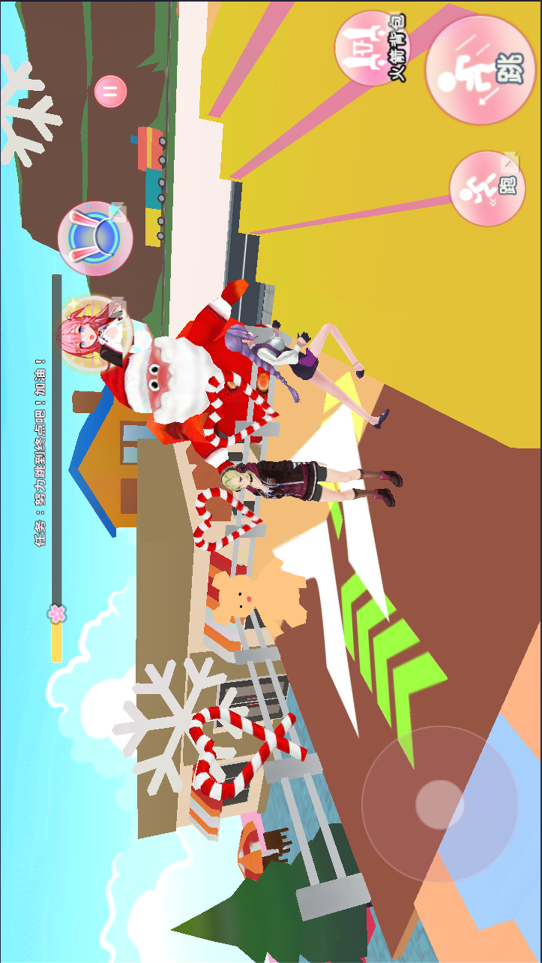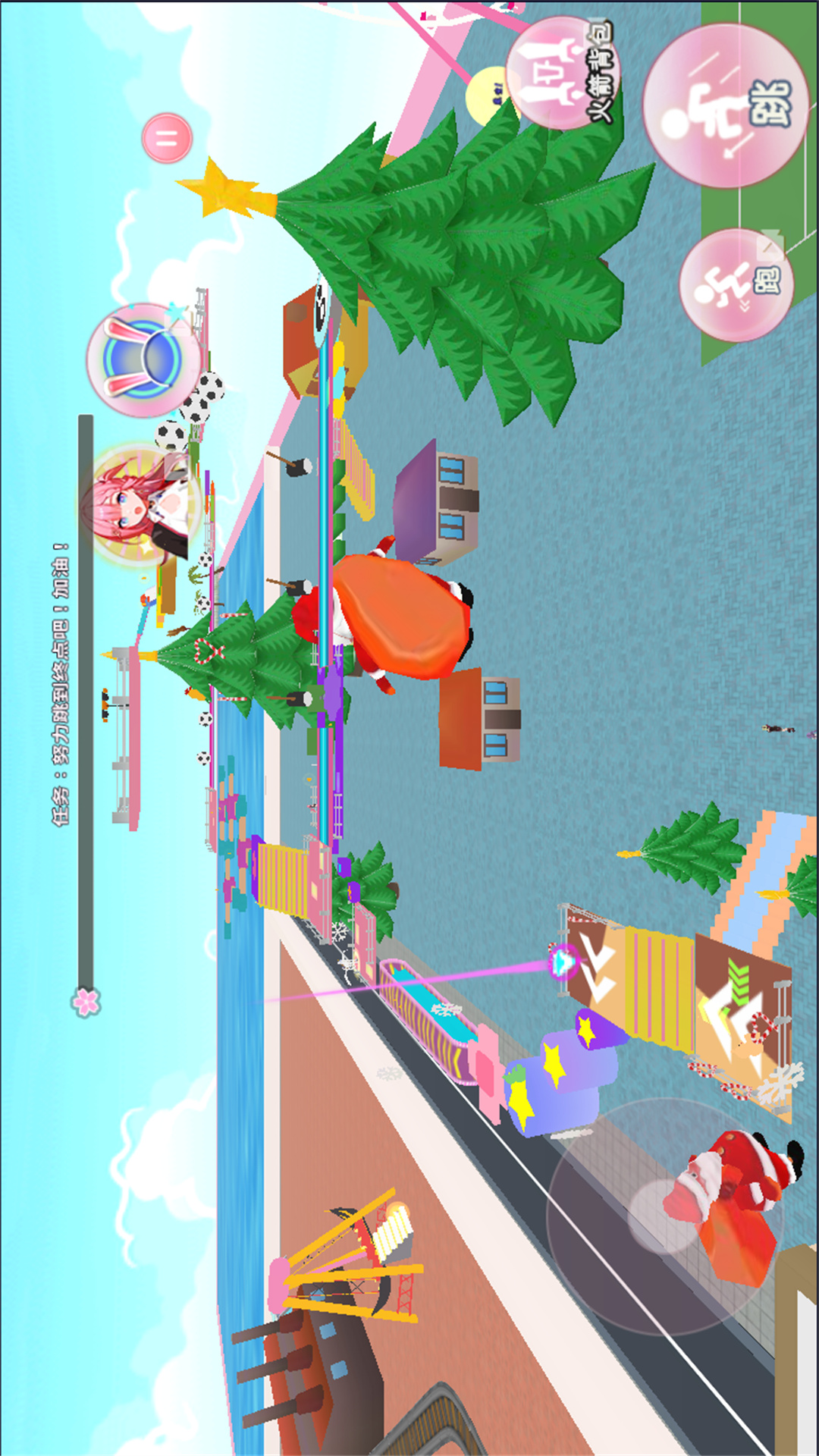 1. 精美的视觉效果:樱花乐园跑酷游戏场景充满了圣诞气息,雪花飘落、圣诞树闪烁,营造出温馨的节日氛围,让玩家仿佛置身于一个梦幻的乐园中。