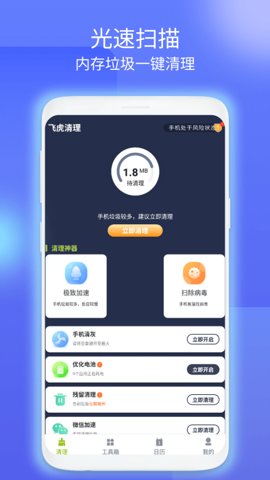 飞虎清理app是一款专为手机用户设计的清理优化工具,致力于提升手机的使用效率。能够快速扫描手机内存,还能一键清理各类垃圾文件,让你的手机保持最佳状态。无论是玩游戏还是日常使用,飞虎清理都能为你提供流畅的体验。通过简单的操作,你就能释放出更多的存储空间,告别卡顿和慢速的问题,轻松享受手机带来的乐趣。