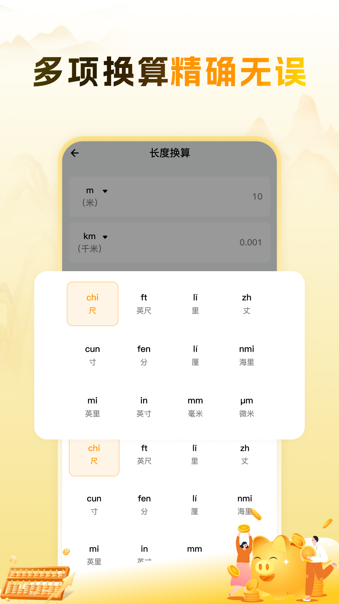 2、单位转换:实现长度从米到英尺、重量从公斤到磅、温度从摄氏度到华氏度等多种体系的即时互转。