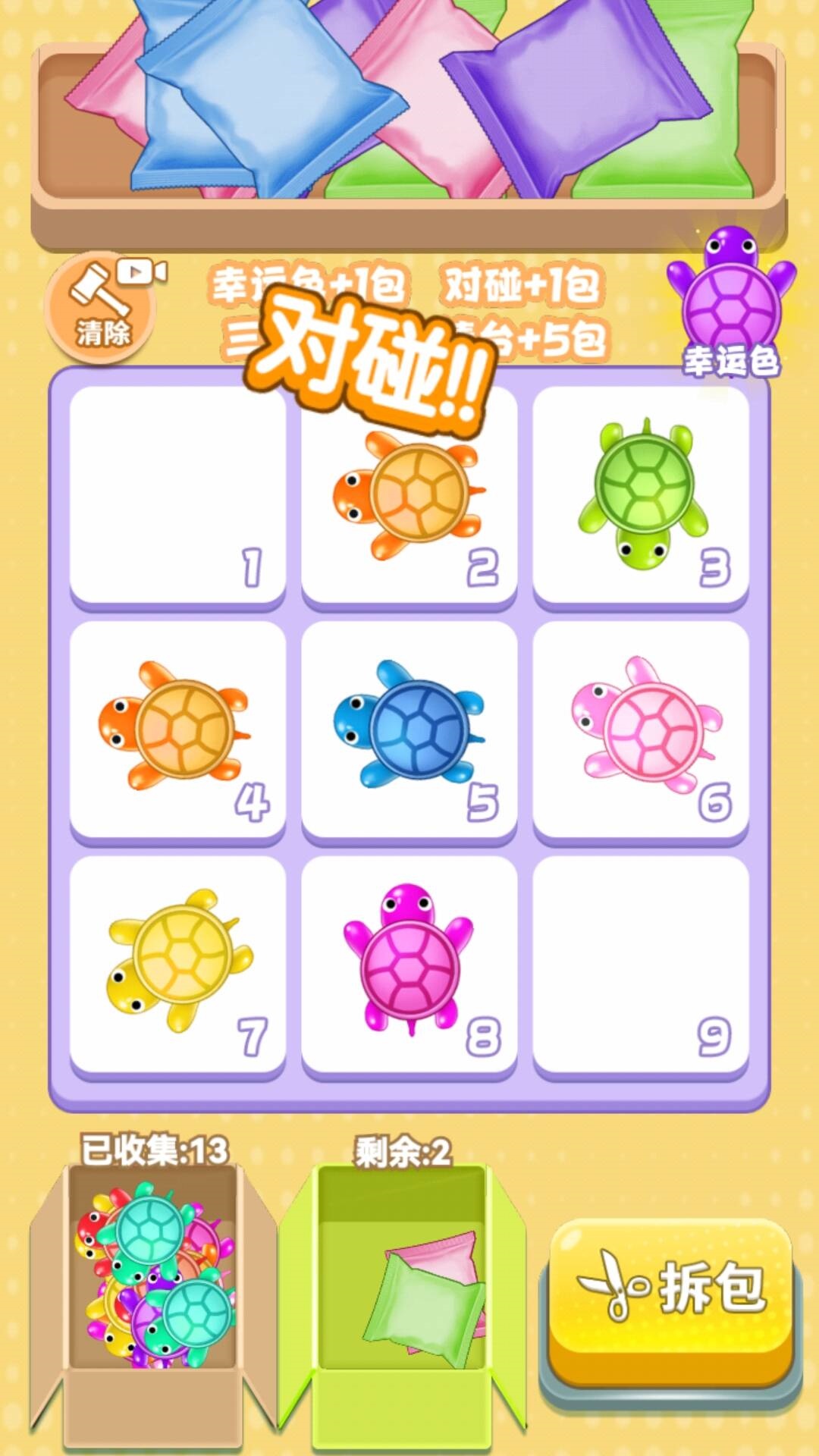 欢趣对对碰是一款全新的单机休闲益智游戏,专为喜欢挑战和乐趣的玩家设计。游戏以可爱的乌龟为主题,玩家将在神秘的乌龟王国中展开一场充满惊喜的冒险。通过简单的点击操作,收集、解锁各种独特的乌龟玩具,享受拆盲盒的乐趣,体验双倍惊喜的快感。游戏画面色彩丰富,视觉效果令人愉悦,带给玩家无与伦比的游戏体验。