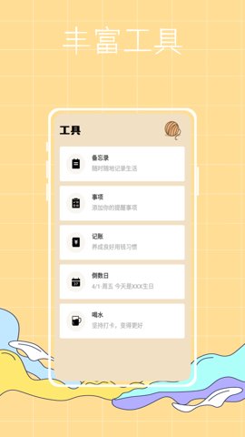 2、提供可爱的手绘图标,让每个事件的记录变得更加生动有趣,增加了使用的乐趣。