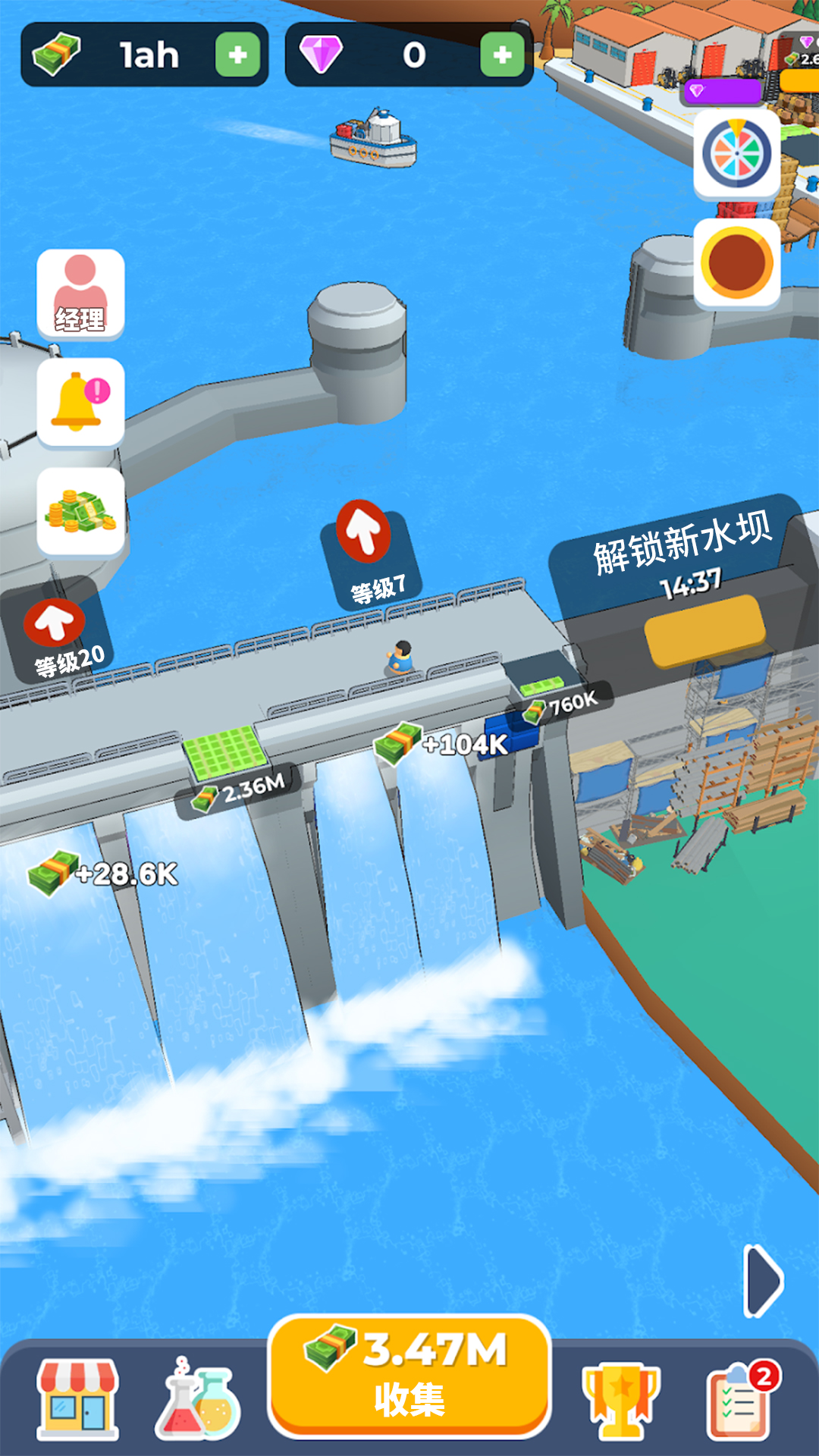 1. 水坝建造:玩家将从一个简单的小水坝开始,逐步扩展成一个庞大的水坝结构。每个部分都可以单独升级,提升其功能和产出,增加收益。通过合理的资源分配和策略规划,玩家可以快速提升水坝的规模和效益。