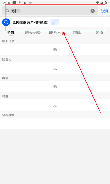 2、在搜索框中输入电鸽号,系统会优先显示已添加为联系人的用户信息。找到目标用户后即可查看详情,如需更广范围的搜索,可点击“全网搜索”。
