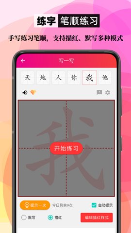 3、内置动画演示功能,展示汉字的笔顺书写过程,并配有语音播报,适合不同学习需求的用户。