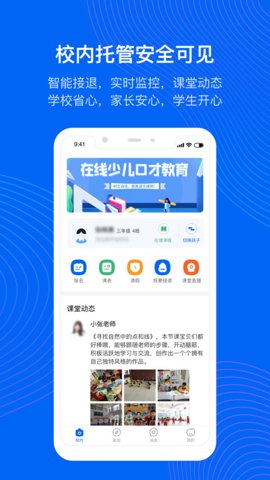 家长可以在app首页进入“课堂动态”模块,查看老师发布的孩子课堂表现及相关照片,了解孩子的学习情况。