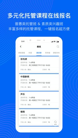 1、在线报名功能,家长可以根据需求自由选择托管服务及课程,方便快捷。