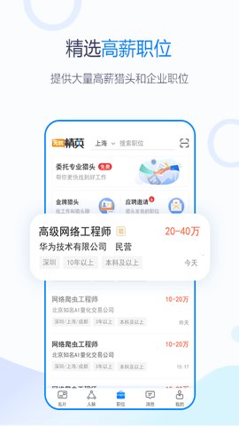 无忧精英app是一款专为求职者与猎头打造的创新型应用,旨在为用户提供高效的求职体验。这款应用打破了传统招聘的模式,通过独特的名片招聘概念,将求职与人脉建立紧密结合。用户不仅可以轻松找到高质量的工作机会,还能通过线上互换名片建立起广泛的人脉网络,发掘更多潜在的职业机会。无论是刚毕业的大学生,还是经验丰富的职场精英,无忧精英app都能为你提供合适的选择和支持。