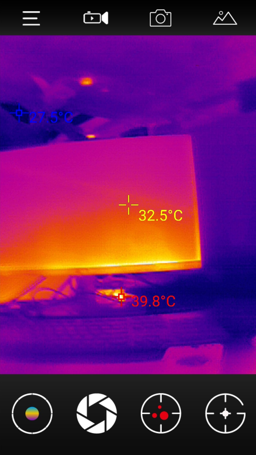 4、需要对特定区域测温时,使用屏幕上的十字光标对准目标,界面会实时显示该点的温度数值。