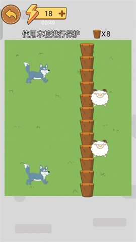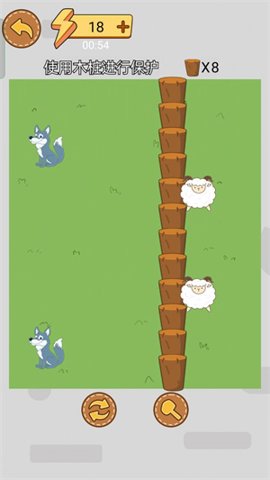 在游戏开始时,玩家会看到一片羊群和潜伏的大灰狼。玩家的任务是利用屏幕下方的木桩,围住小羊,确保它们不被狼群侵害。木桩的数量是有限的,因此玩家需要仔细思考每一步的放置,确保没有留出任何缝隙。每个关卡的布局都不同,玩家需要根据实际情况灵活应对,寻找最佳的围栏方案。