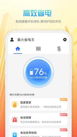 在最火省电王的主界面上找到电池状态监测功能,点击进入即可查看电量、温度等详细信息。