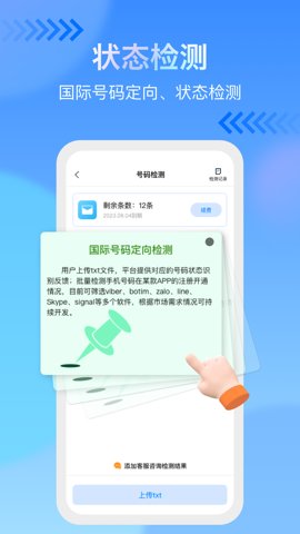 3、能够检测号码是否在特定应用程序中注册,帮助用户了解目标客户的使用习惯。