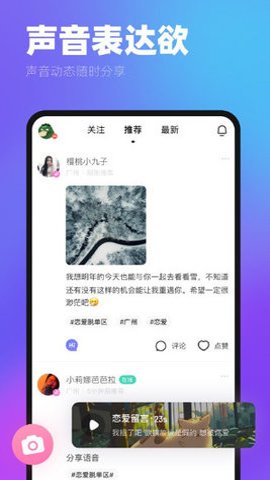 3、以声音为主导的社交平台,让用户在这里找到志同道合的朋友,分享彼此的声音动态。