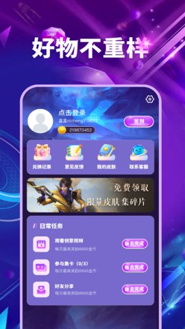 皮肤多多免费领app是一款非常实用的游戏盒子,专为热爱游戏的玩家们打造。它汇聚了丰富的游戏皮肤资源,通过完成简单的任务来获得积分,进而兑换各种游戏皮肤。无论是新手玩家还是资深游戏迷,都能在这里找到心仪的皮肤,享受游戏带来的乐趣。每天都有新的福利和活动等着你,快来一起体验吧!
