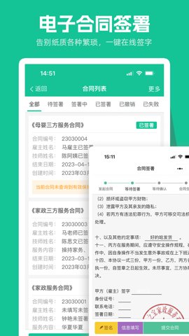 1、支持一键签约,企业可以直接在平台上与家政人员进行合同签署,简化了传统的签约流程。