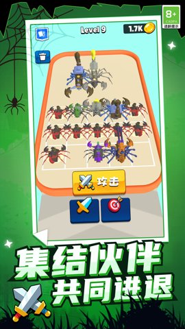 在游戏开始时,玩家将控制一只小蜘蛛,在地图上穿越各种障碍。你需要通过合并相同的小蜘蛛机甲来提升自己的战斗力,合成后的机甲将具备更强的能力,能够更轻松地击败敌人。随着游戏的进行,玩家会遇到越来越多的敌人和障碍,必须灵活应对,寻找合适的合并时机,才能顺利前进。