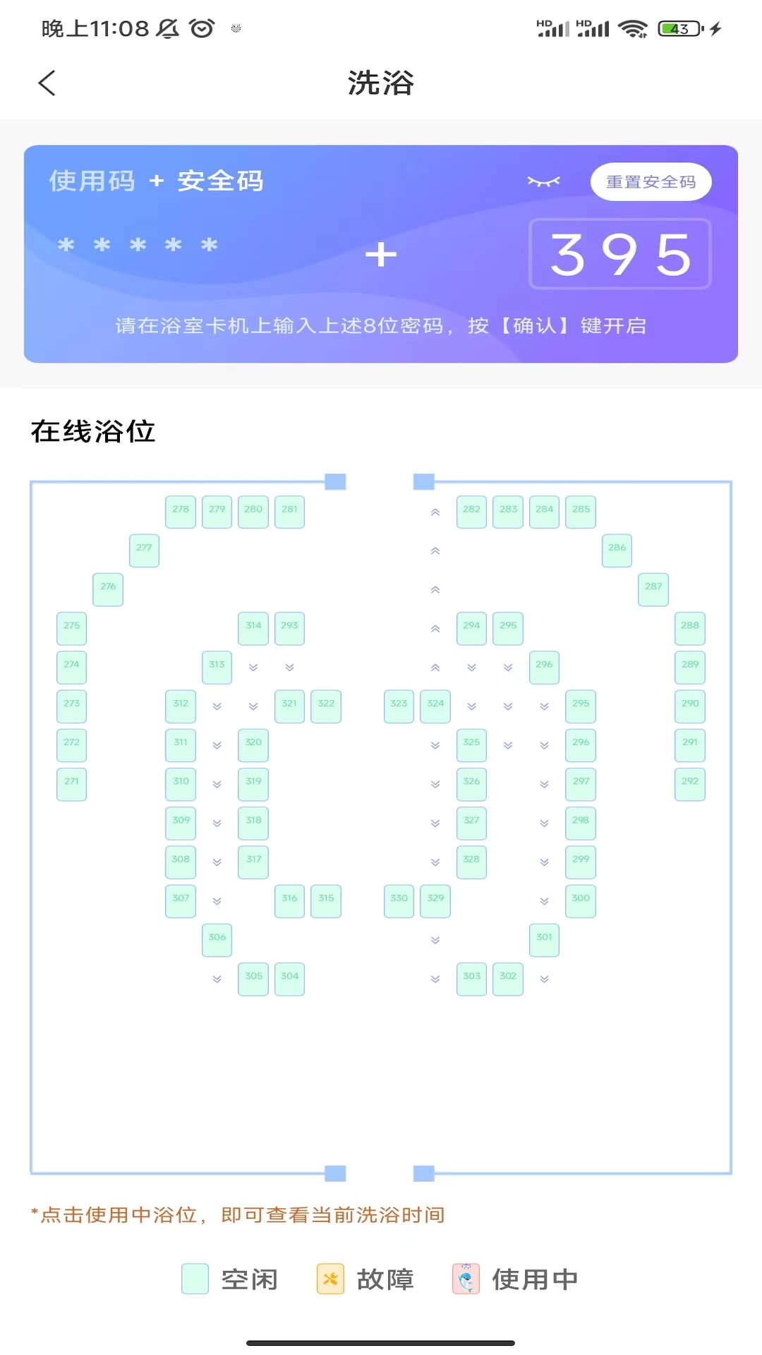 4、在洗浴服务页面,实时查看澡堂的在线情况,选择合适的时间进行洗浴。