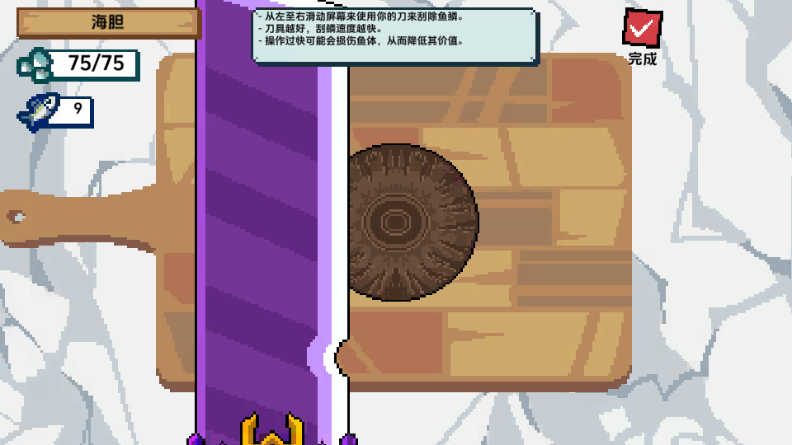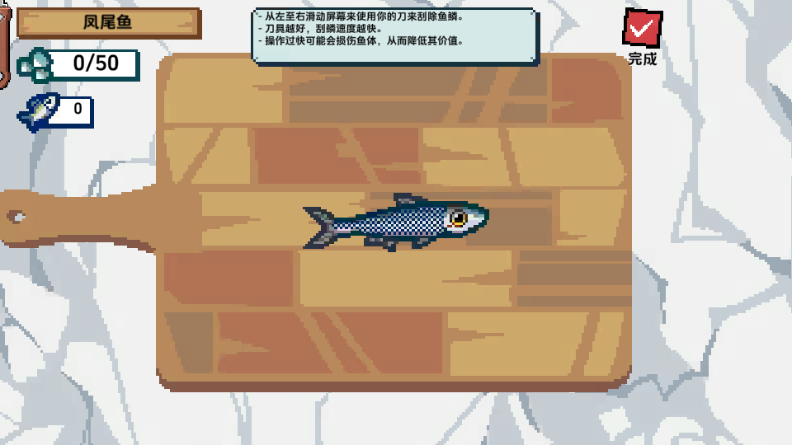 玩家首先需要通过滑动屏幕来使用刀具刮除鱼鳞,操作简单却需要一定的技巧,刀具的品质直接影响刮鳞的速度和效果。