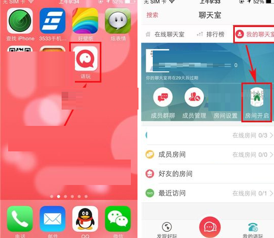 先启动【语玩】App,点击进入【我的聊天室】,然后点击【房间开启】,进入你创建的语音房间。