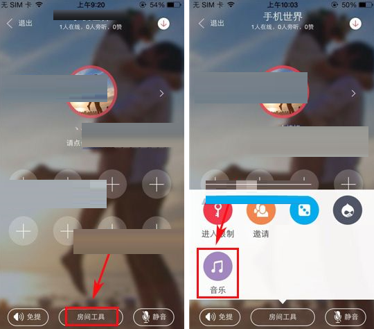 进入房间后,点击界面中的【房间工具】,在弹出的菜单里选择【音乐】选项。