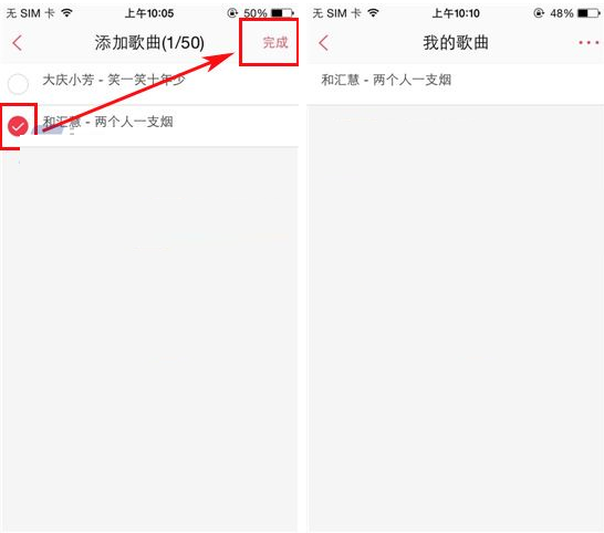在歌曲列表中,找到你想播放的歌曲,点击选中,最后点击【完成】,即可成功将歌曲添加到房间音乐列表中。