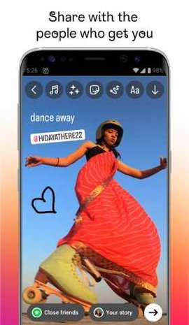 2、故事拍摄与分享:使用相机直接拍摄或从相册选择素材,以故事形式发布,24小时后自动消失。
